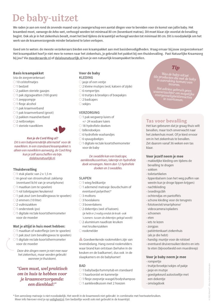 Om je voor te bereiden op de komst van je baby, heeft de KraamzorgApp een handige uitzetlijst opgesteld. Deze lijst geeft een overzicht van de benodigde items, zodat je ervoor kunt zorgen dat je alles in huis hebt voordat de baby wordt geboren.